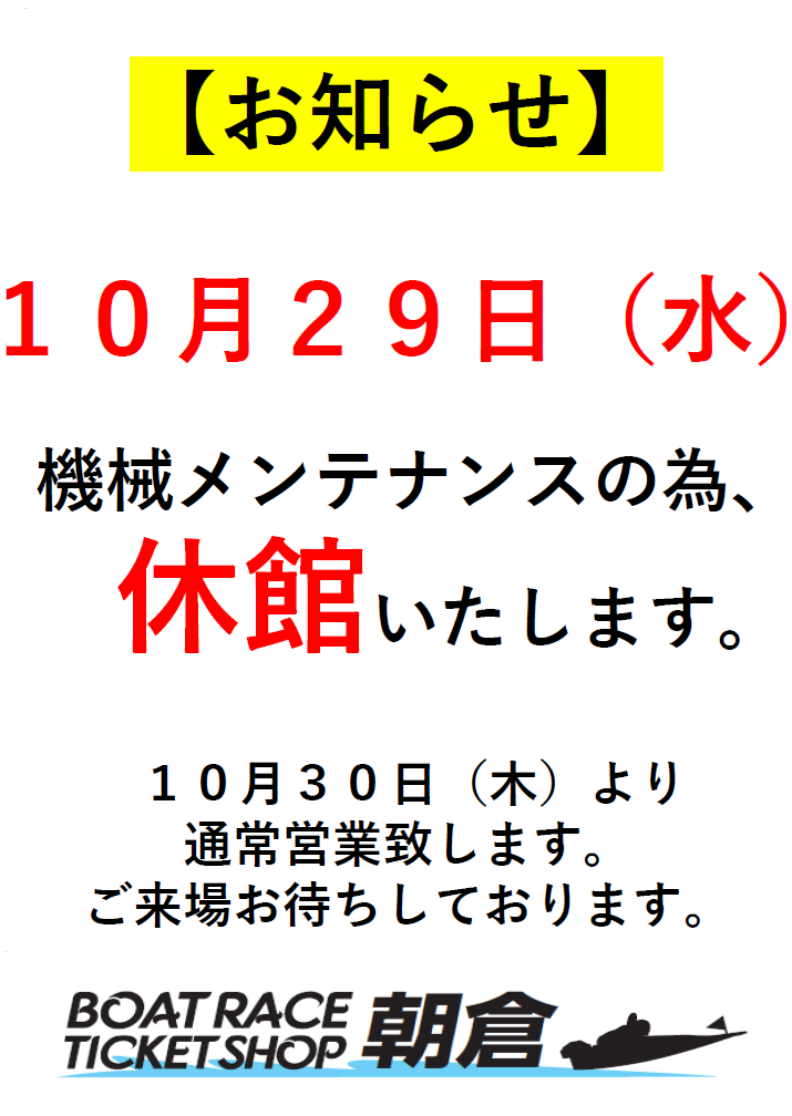 10月29日(水) 機械メンテナンスの為、休館いたします