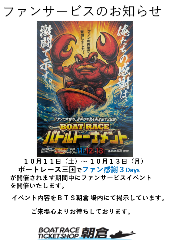 10/11(土)~10/13(月祝) ファン感謝 3Day がボートレース三国にて開催されます。