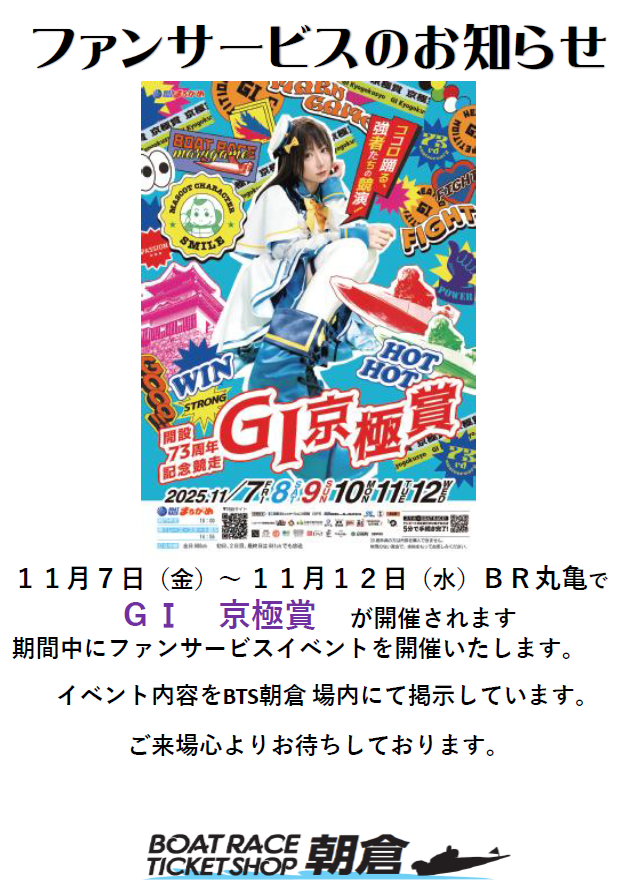 11/7(金)~11/12(水) GⅠ 京極賞がボートレース丸亀にて開催されます。