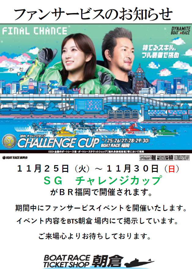 11/25(火)~11/30(日) SG チャレンジカップがボートレース福岡にて開催されます。