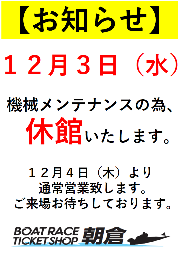 12月3日(水) 機械メンテナンスの為、休館いたします。