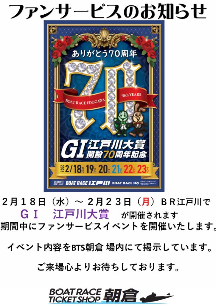 2/18(水)~2/23(月) GⅠ 江戸川大賞がボートレース江戸川にて開催されます。