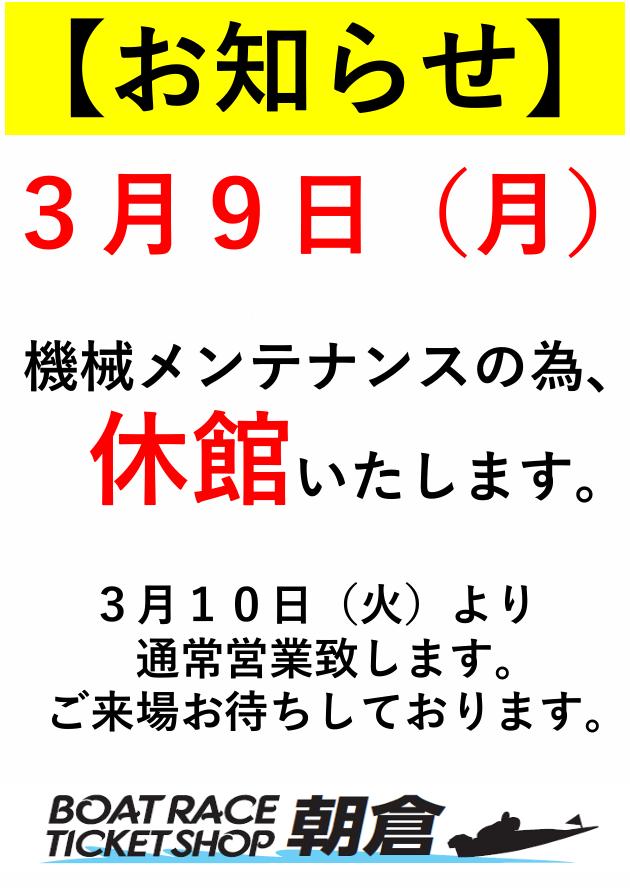 3月9日(月) 機械メンテナンスの為、休館いたします。
