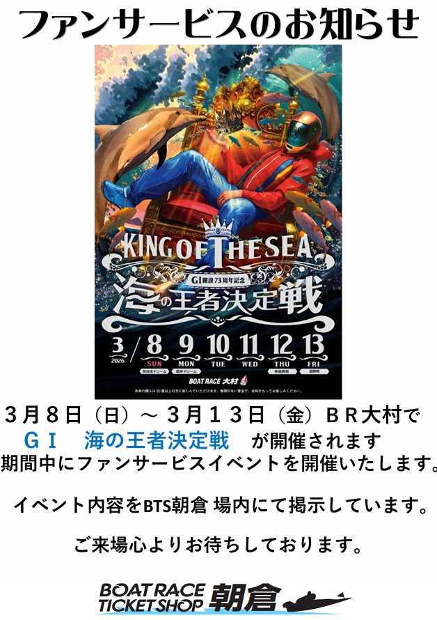 3/8(日)~3/13(金) GⅠ 海の王者決定戦がボートレース大村にて開催されます。
