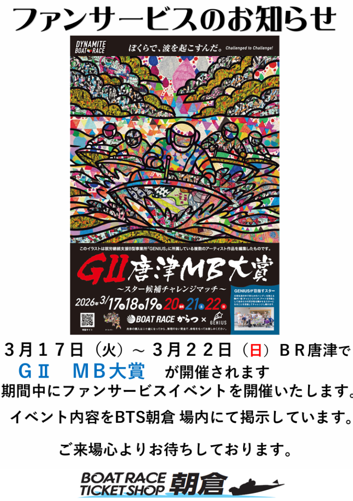 3/17(火)~3/22(日) GⅡ MB大賞がボートレース唐津にて開催されます。