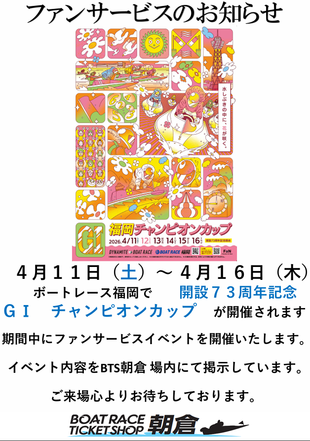 4/11(土)~4/16(木) GⅠ チャンピオンカップがボートレース福岡にて開催されます。