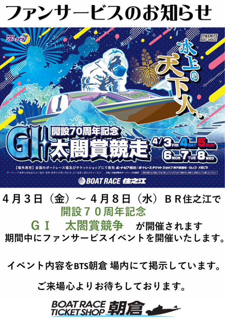 4/3(金)~4/8(水) GⅠ 太閤賞競走がボートレース住之江にて開催されます。